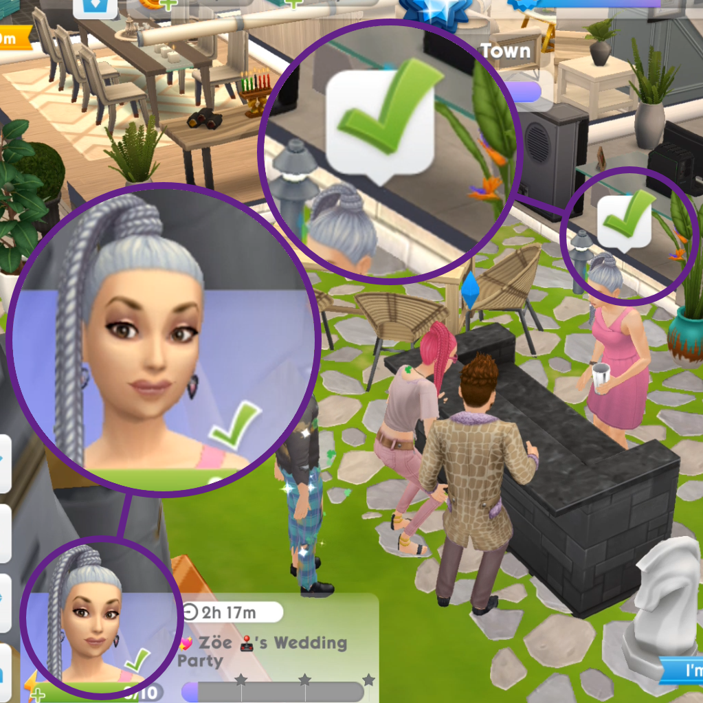 Habrás observado las burbujas blancas con una estrella rosa cuando tu Sim realiza acciones durante eventos, misiones y alrededor de su casa. Las animaciones de tu Sim solían reproducirse durante 5 segundos y luego habrías visto una marca verde sobre su cabeza, para recolectar recompensas.